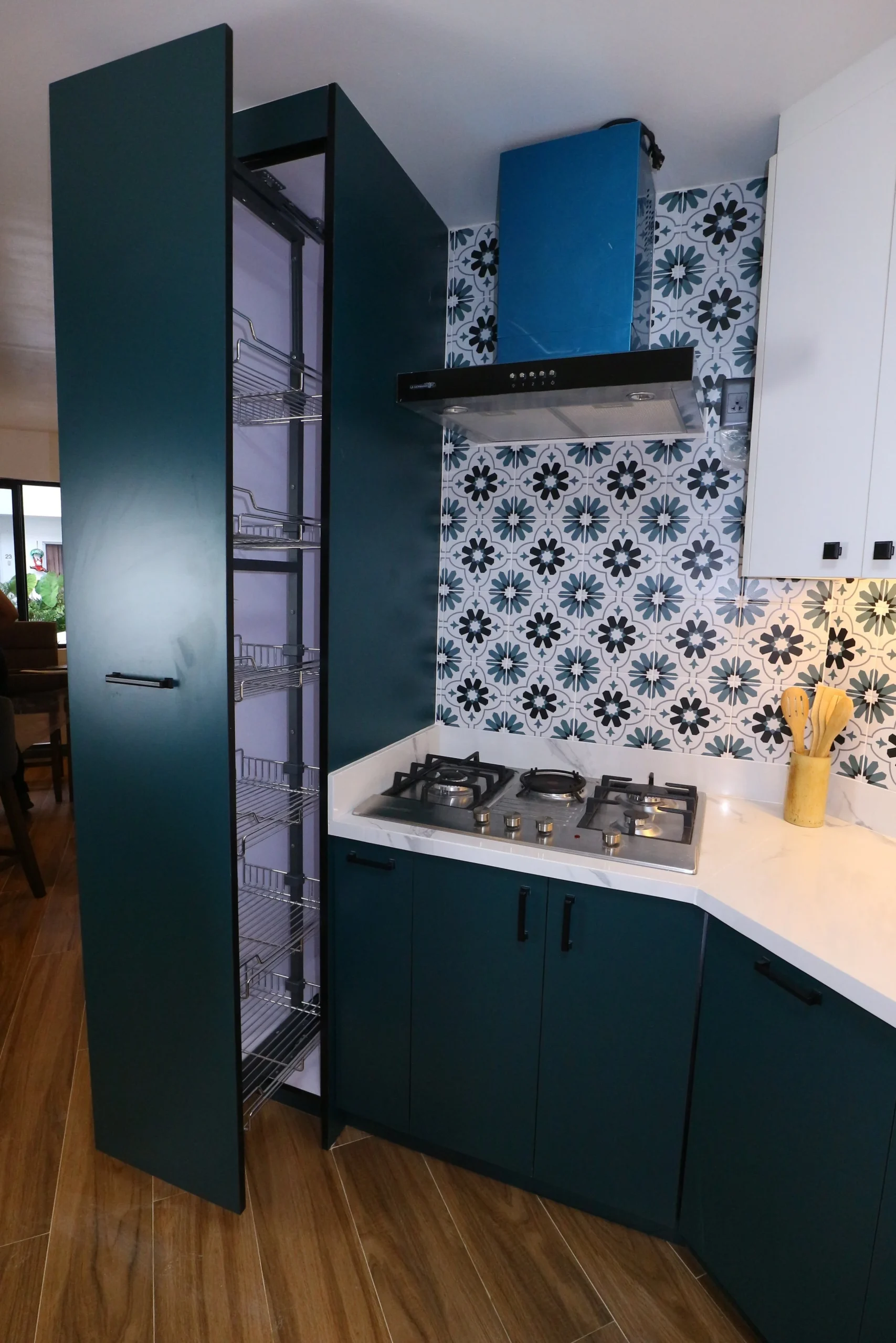 First of many green themed kitchen. This particular project was a bit of a surprise for us in terms of design. And boy the result was even more amazing than we anticipated. Peacock green laminated marine wood was a nail-biter as we couldn’t imagine how it would blend with their wood plank floorings. But along with calacatta countertop accompanied by a warm embrace of day light, it’s just impossible not to fall in love with it. Agreed?