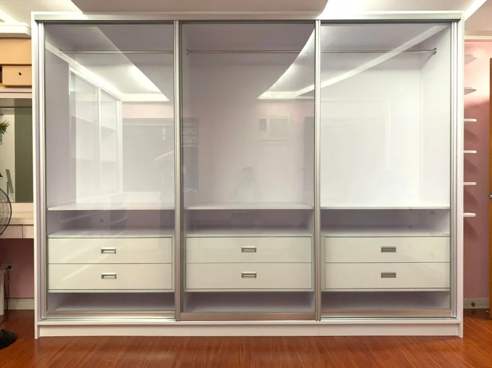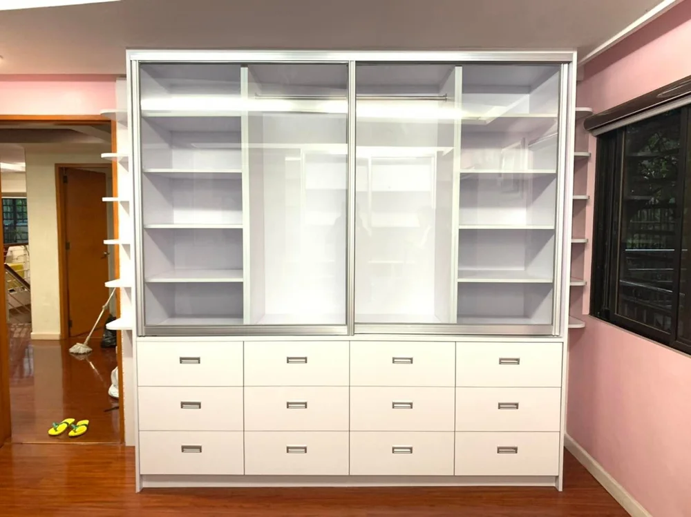 Starting with three full-size cabinets 8’x4’ beautifully designed with white high gloss boards. Each of them has been custom designed to serve a specific purpose. And it’s to display our client’s luxurious handbag collections. With these many shelves, you can only imagine the amount of bags she can now freely put on.