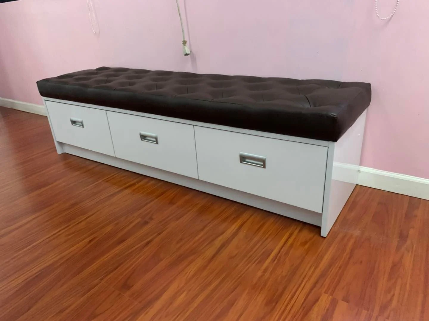 The shoe bench also earned its spot here. With soft cushioning and tailored buttons, this state-of-the-art shoe bench is every bit of glamorous as it is comfortable. Built with high gloss whiteboards per cabinet, aluminum handles, and Blum soft close hinges.