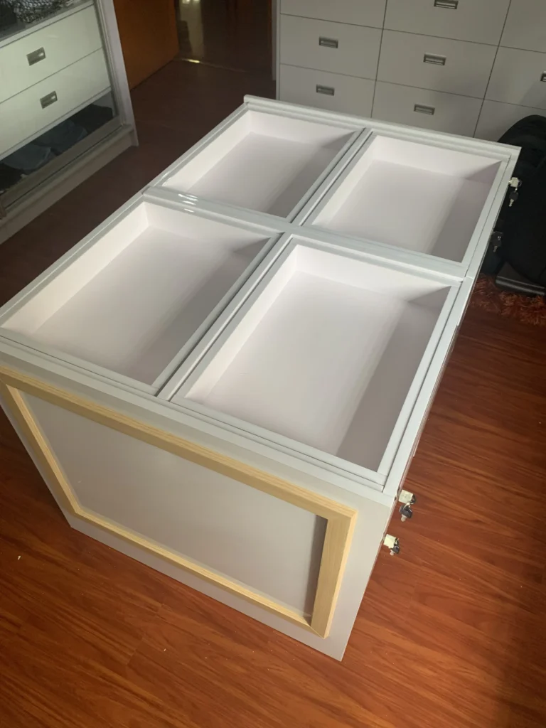 And to top it all off, a center island that boasts extravagance wherever you look. Take note that this is not your ordinary island. Each side has dedicated locks per drawer. The very top is where they intend to exhibit their most prized jewelry.