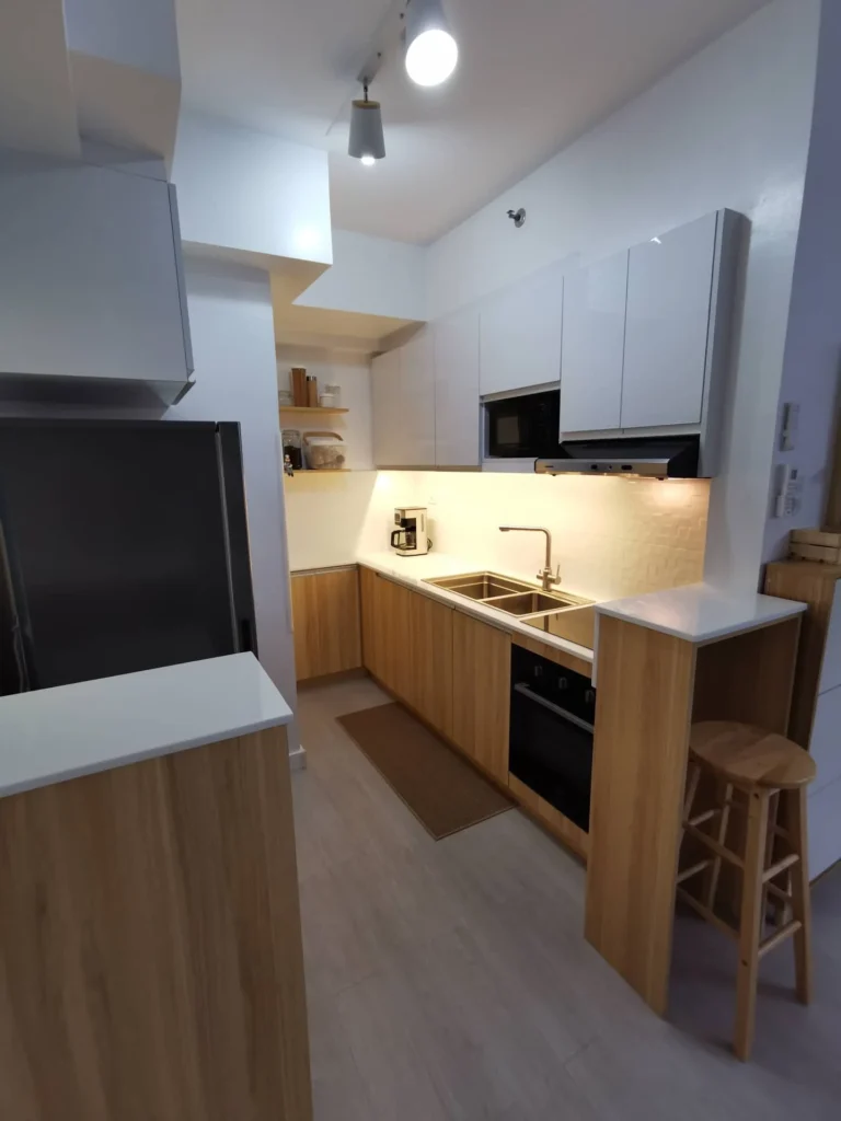 One of our proudest DMCI projects in Prisma Residences Pasig. Our clients themselves neatly designed this unit. They painstakingly considered every color that would play around their brand new home. This Scandinavian inspired unit was a masterpiece with a good combination of high gloss white boards and sunlit maple wood finish.